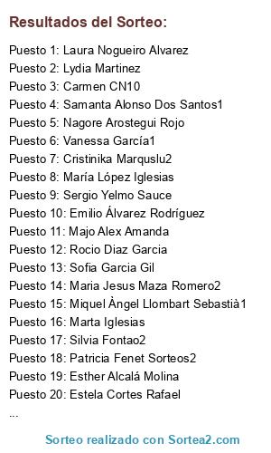 Lista de participantes: Elena Lopez, ¿donde HAY Sorteos?, Adriana Oliva, Agustin Villanueva Gabarro, Ailatan Taly1, Ailatan Taly2, Ainhoa Baul, Akane Ojitos de Madera, Alazne Ypunto1, Alazne Ypunto2, Alicia Nuñez Diego1, Alicia Nuñez Diego2, Almudena Hernandez Padilla, Amaia Torres Sánchez1, Amaia Torres Sánchez2, Amaya Legaz1, Amaya Legaz2, Amaya Legaz3, Amaya Legaz4, Amparo Sahagún, Ana Belen Garcia L1, Ana Belen Garcia L2, Ana Bertol, Ana Cruz, Ana Glez1, Ana Glez2, Ana Guirado Campos1, Ana Guirado Campos2, Ana Guirado Campos3, Ana Isabel Fernández, Ana Maria Mayor Sanchez1, Ana Maria Mayor Sanchez2, Ana Maria Ramos, Ana Marya Sanchez, Ana Troco Troco, Andrea Sánchez Veigas, Andrea Soldini1, Andrea Soldini2, Andrés Villalón Rodríguez, Ángela Cano, Angela Chamizo Castilla, Angela Rodriguez Salazar, Angelina Mateo Ferrer, Angie Gomez1, Angie Gomez2, Angie Gomez3, Angie Gomez4, Anna Surdé Miralda, Antonio GN, Antonio Segura1, Antonio Segura2, Anyka Sanchez Mnz, Arantxa De Ayarra, Azu Cigales, Beatriz Busto Dure, Beatriz Marcos, Beatriz Serrano Branchadell, Blanca Estrada, Buscador de Sorteos, Cardab Dom Abeledo, Carlos Garcia Gonzalez, Carlos Lopez F, Carmen Blanco F, Carmen Bravo Garcia1, Carmen Bravo Garcia2, Carmen CN1, Carmen CN2, Carmen CN3, Carmen CN4, Carmen CN5, Carmen CN6, Carmen CN7, Carmen CN8, Carmen CN9, Carmen CN10, Carmen Díaz1, Carmen Díaz2, Carmen la Abuela1, Carmen la Abuela2, Carmen Mora, Carmen Paredes Díaz, Carmen Tello, Ceci Bacotua, Chencha Finez1, Chencha Finez2, Chencha Finez3, Clara Soriano1, Clara Soriano2, Clara Soriano3, Concepcion Matias Simarro, Concursos Sorteos Regalos, Consuelo Morales Rivero, Cris Cristina Tello, Cris Puebla, Cristina Expósito Fouz, Cristina Gregorio, Cristina Ortola Tello, Cristina Ramos1, Cristina Ramos2, Cristina Ramos3, Cristina Soria Vilella, Cristinika Marquslu1, Cristinika Marquslu2, Cristobal Rabadan, DaRa Santana, Desiree Del Rio1, Desiree Del Rio2, Desiree Del Rio3, Diana Fernandez, Dolores Soler Rodriguez, E Jose Alvarez, Elena Radu, Elena Riberas1, Elena Riberas2, Elena Sánchez, Elisabeth Nuñez Olivero, Emilio Álvarez Rodríguez, Encarna Sanchez Dominguez, Encarnacion Gullon Arias, Encarni F. Estevez, Encarni Garcia, Encarni Muñoz Serrano, Encarni Sanchez Alanis, Erika Alvarez, Erika Montes Pérez, Esme Ch, Estela Cortes Rafael, Ester Fernandez Muro, Esther Alcalá Molina, Esther Ramirez, Eva Pavon Fernandez, Francisco Chatao Novelles, Francisco Javier Martinez Romero, Fuensanta Carrillo, Garbiñe Melgosa Herran, Gema Herrero Guemes, Gemma Benito Lopez, Gladys Parra Navas1, Gladys Parra Navas2, Gladys Parra Navas3, Gloria Urquidi, Hadaly Rodriguez, Heather Jimenez, Inma Cervera, Inma Martinez Perez, Irene Cid, Irene Navarro Fuster, Isabel Ojitos de Madera, Isabel Sanchez M1, Isabel Sanchez M2, Isabel Sanchez M3, Isadora Mayandia, Ivan Martin Casas, Javier Soriano, Jennifer Bonilla Pizarro1, Jennifer Bonilla Pizarro2, Jenny Perez Diaz1, Jenny Perez Diaz2, Jessy Fuengi1, Jessy Fuengi2, Jesús Escudero Sahagún1, Jesús Escudero Sahagún2, Jesús Márquez, Jetzabel Teruel, Joan Galvez Lanzas, Jose C. Perez, Jose Carlos Rabadan, Jose Javier Nieto, Jose Julian Escudero, Jose Pla, Josefa Gálvez Lanzas1, Josefa Gálvez Lanzas2, Josefa Gálvez Lanzas3, Josefa Peregrina Morales1, Josefa Peregrina Morales2, Joy Gonzalez, Judith Pérez, Julia Lanzas Orejuela1, Julia Lanzas Orejuela2, Julia Prieto, Julián Hernández, Julian Sanz Muñoz1, Julian Sanz Muñoz2, Kaprichos Q Enamoran, Lara Galan, Laura Jimenez1, Laura Jimenez2, Laura Jimenez3, Laura Jimenez4, Laura Jimenez5, Laura Nogueiro Alvarez, Leticia Piriz Mateos, Lidia Lydia Gomez Rodriguez, Lily Gonz1, Lily Gonz2, Lily Gonz3, Lily Gonz4, Loren Cano Soler, Lorena Felina, Los Trapitos De Esther Los Trapitos de Esther, Luigi Chaparro Romero, Luisa Ibáñez Lacambra, Luz Divina Vega Luján, Lydia Gomez Rodriguez, Lydia Lopez Millan, Lydia Martinez, M Angeles Flores Zarallo1, M Angeles Flores Zarallo2, M Angeles Flores Zarallo3, M Carmen Sobrino Astillero, Macarena Soria1, Macarena Soria2, Macarena Soria3, Macarena Soria4, Mafalda Ortiz, Magdalena Alvarez Roman, Maite Garcia Parra1, Maite Garcia Parra2, Maite Garcia Parra3, Majo Alex Amanda, Mamen Carlos, Mami De Bebe Friki, Manoli CarPa, Mara Carbonell, Mara Vaño, Marcela Ulehla Mrazova, Mari Carmen Bobi Granados1, Mari Carmen Bobi Granados2, Mari Carmen Bobi Granados3, Mari Carmen Sanchez, Mari Luz Perez Martinez, Mari Trini Ruiz Requena1, Mari Trini Ruiz Requena2, Mari Trini Ruiz Requena3, María A Ferrero, Maria Asuncion Arias, Maria Carmen Delgado R1, Maria Carmen Delgado R2, Maria Del Carmen Gonzalez Aranda, Maria Jesus Maza Romero1, Maria Jesus Maza Romero2, Maria Jesus Maza Romero3, Maria Jose Mateo Hurtado, Maria Jose Moreno Serrano1, Maria Jose Moreno Serrano2, Maria Jose Rosa Álvarez, María López Iglesias, Maria Mar Arjona1, Maria Mar Arjona2, Maria Martinez Blanco, Maria Motrico Barrero, María Rosa Gómez, Maria Ruiz Lopez, Mariajesusychico Serrano Morcillo1, Mariajesusychico Serrano Morcillo2, Mariaydana Bisutería, Maribeco Cp, Maribel González, Marilo Hernandez Gomez1, Marilo Hernandez Gomez2, Marilo Hernandez Gomez3, Marisol Nieto N, Marta Iglesias, Marte Mendez, Maru Diego Carmona1, Maru Diego Carmona2, Mary Lopez Cla1, Mary Lopez Cla2, Mary Maza Romero1, Mary Maza Romero2, Mary Maza Romero3, Mary Maza Romero4, Mary Maza Romero5, May Lopez, Mdolores Paez Martinez, Melania Garcia Lopez, Melissa G CH, Mercedes Gil Campos, Miguel Tola, Mini Torres1, Mini Torres2, Miquel Àngel Llombart Sebastià1, Miquel Àngel Llombart Sebastià2, Miriam Oliver, Miriam Rodriguez Martinez, Miscosucas Gomaeva, Moli Val, Monica Cespedes Morales, Monica Herrerias1, Monica Herrerias2, Monica Herrerias3, Monica Herrerias4, Monica Lestón Dominguez, Mónica Prieto García, Montse Fernandez Martin, Myriam Adsuar Paez, Nagore Arostegui Rojo, Natalia Salucci, Natalia Sanchez1, Natalia Sanchez2, Natalia Sanchez3, Nerea Gom