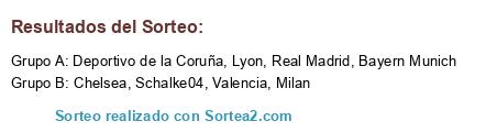 Lista de participantes: Bayern Munich, Schalke04, Valencia, Deportivo de la Coruña, Lyon, Real Madrid, Chelsea, Milan.