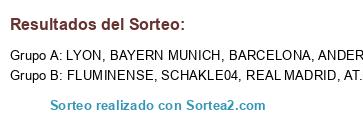 Lista de participantes: SCHAKLE04, BAYERN MUNICH, REAL MADRID, BARCELONA, LYON, ANDERLECHT, AT.MADRID, FLUMINENSE.