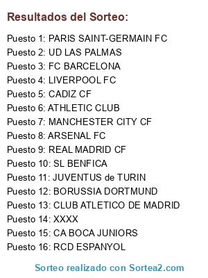Lista de participantes: FC BARCELONA, CLUB ATLETICO DE MADRID, REAL MADRID CF, MANCHESTER CITY CF, RCD ESPANYOL, UD LAS PALMAS, ARSENAL FC, ATHLETIC CLUB, SL BENFICA, BORUSSIA DORTMUND, LIVERPOOL FC, CADIZ CF, CA BOCA JUNIORS, PARIS SAINT-GERMAIN FC, JUVENTUS de TURIN, XXXX.