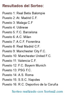 Lista de participantes: Real Madrid C.F., S.S.C. Napoles, F.C. Bayern Munich, Udinese, A.S. Roma, Valencia C.F., R.C. Deportivo de la Coruña, Manchester United F.C., Real Betis Balompie, A.C.F. Fiorentina, At. Madrid C.F., Manchester City F.C., Malaga C.F, A.C. Milan, F.C. Barcelona, PSG F.C..