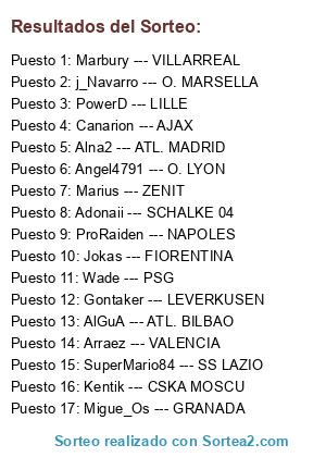 Lista de participantes: Gontaker --- LEVERKUSEN, ProRaiden --- NAPOLES, Black Ichigo --- BORUSSIA DORTMUND, Migue_Os --- GRANADA, Alna2 --- ATL. MADRID, Angel4791 --- O. LYON, Canarion --- AJAX, Marius --- ZENIT, AlGuA --- ATL. BILBAO, Adonaii --- SCHALKE 04, Marbury --- VILLARREAL, SuperMario84 --- SS LAZIO, Kentik --- CSKA MOSCU, Wade --- PSG, Jokas --- FIORENTINA, j_Navarro --- O. MARSELLA, PowerD --- LILLE, PabloAquino --- JUVENTUS, Arraez --- VALENCIA.