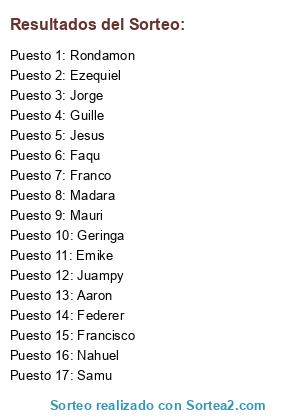 Lista de participantes: Emike, Jorge, Ezequiel, Aaron, Franco, Francisco, Juampy, Madara, Rondamon, Faqu, Samu, Mauri, Geringa, Nahuel, Federer, Jesus, Guille.