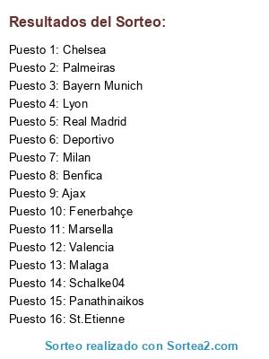 Lista de participantes: Schalke04, Bayern Munich, Chelsea, Milan, Benfica, Lyon, Real Madrid, Valencia, Deportivo, Panathinaikos, Ajax, Malaga, Marsella, St.Etienne, Fenerbahçe, Palmeiras.