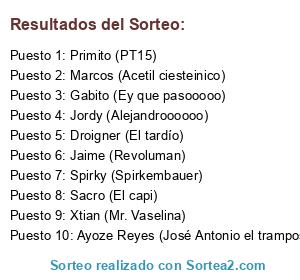 Lista de participantes: Primito (PT15), Jordy (Alejandroooooo), Marcos (Acetil ciesteinico), Gabito (Ey que pasooooo), Sacro (El capi), Spirky (Spirkembauer), Jaime (Revoluman), Droigner (El tardío), Xtian (Mr. Vaselina), Ayoze Reyes (José Antonio el tramposo).