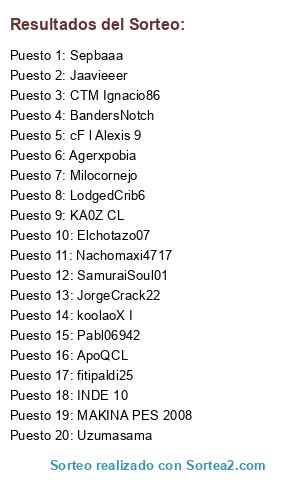 Lista de participantes: koolaoX I, cF l Alexis 9, Sepbaaa, ApoQCL, fitipaldi25, CTM Ignacio86, Milocornejo, Uzumasama, Elchotazo07, Jaavieeer, Pabl06942, MAKINA PES 2008, KA0Z CL, BandersNotch, SamuraiSoul01, INDE 10, Nachomaxi4717, JorgeCrack22 , Agerxpobia, LodgedCrib6, .
