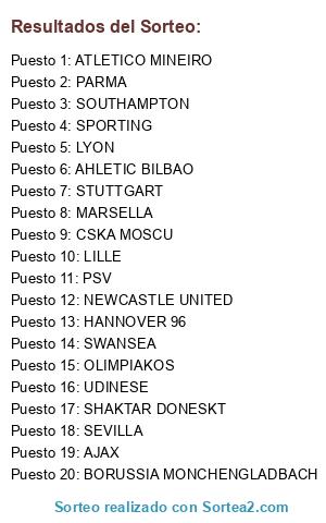 Lista de participantes: SHAKTAR DONESKT, SWANSEA, SEVILLA, AHLETIC BILBAO, CSKA MOSCU, NEWCASTLE UNITED, HANNOVER 96, ATLETICO MINEIRO, SPORTING, MARSELLA, LYON, LILLE, PARMA, STUTTGART, BORUSSIA MONCHENGLADBACH, SOUTHAMPTON, AJAX, PSV, UDINESE, OLIMPIAKOS.