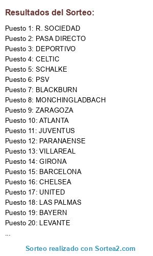Lista de participantes: LAS PALMAS, VILLAREAL, SCHALKE, BAYERN, ZARAGOZA, KAIZER, ATLANTA, PASA DIRECTO, BARCELONA, BLACKBURN, LEVANTE, UNITED, DEPORTIVO, MONCHINGLADBACH, PARANAENSE, PSV, R. SOCIEDAD, GIRONA, CHELSEA, CELTIC, BETIS, JUVENTUS.