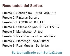 Lista de participantes: Schalke 04 - REAL MADRID, Real Viyamal - EscuelaVieja, BANGKOK UNITED, Manchester United, Flamengo - ADN Futbol, Real Murcia - Beniel f.c, Olimpic de lyon - SEV7LLA FC, Pinturas Barcelo.