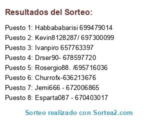 Lista de participantes: Esparta087 - 670403017, Drser90- 678597720, Habbababarisi 699479014, Kevin8128287/ 697300099, Churrofx-636213676, Ivanpiro 657763397, Rosergio88. /695716036, Jemi666 - 672006865.
