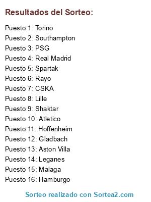 Lista de participantes: Spartak, Real Madrid, Lille, Gladbach, Hoffenheim, Malaga, Leganes, Atletico, PSG, CSKA, Rayo, Aston Villa, Southampton, Torino, Hamburgo, Shaktar.