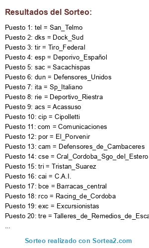 Lista de participantes: cfe = Chaco_for_Ever, cse = Cral_Cordoba_Sgo_del_Estero, tir = Tiro_Federal, cip = Cipolletti, cai = C.A.I., rol = Racing_de_Olavarria, esp = Deporivo_Español, por = El_Porvenir, tel = San_Telmo, rco = Racing_de_Cordoba, arm = Deportivo_Armenio, fla = Flandria, ita = Sp_Italiano, rie = Deportivo_Riestra, sac = Sacachispas, exc = Excursionistas, com = Comunicaciones, acs = Acassuso, dks = Dock_Sud, ant = Juventud_Antoniana, tri = Tristan_Suarez, tre = Talleres_de_Remedios_de_Escalada, dun = Defensores_Unidos, bce = Barracas_central, itu = Ituzaingo, cam = Defensores_de_Cambaceres.