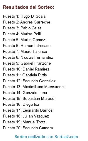 Lista de participantes: Hernan Introcaso, Daniel Ramirez, Manuel Trotz, Marisa Pelli, Gonzalo Luna, Facundo Camera, Gabriel Franzone, Pablo Cejas, Martin Gomez, Maximiliano Maccarone, Gabriela Pittis, Facundo Gonzalez, Diego Isa, Sebastian Mareco, Julian Vazquez, Nicolas Fernandez, Hugo Di Scala, Mauro Tallerico, Andres Garreche, Leonardo Barrios.