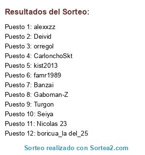 Lista de participantes: alexxzz, Banzai, boricua_la del_25, CarlonchoSkt, Deivid, famr1989, Gaboman-Z, kist2013, Nicolas 23, Seiya, orregol, Turgon, .
