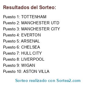 Lista de participantes: WIGAN, ARSENAL, MANCHESTER CITY, MANCHESTER UTD, LIVERPOOL, CHELSEA, EVERTON, TOTTENHAM, ASTON VILLA, HULL CITY.