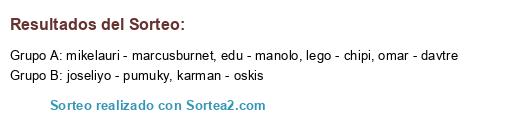 Lista de participantes: edu - manolo, mikelauri - marcusburnet, joseliyo - pumuky, omar - davtre, lego - chipi, karman - oskis.