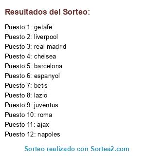 Lista de participantes: barcelona, ajax, napoles, roma, getafe, chelsea, real madrid, liverpool, betis, espanyol, lazio, juventus.