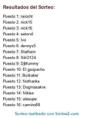 Lista de participantes: Niklas, Dogmasakre, El gazpacho, setorvil, camino88, Ivo, Statham, DjMummy, raicoht, Buitraker, alesupe, dennys5, SikO124, Nothanks, nick15, nick16.