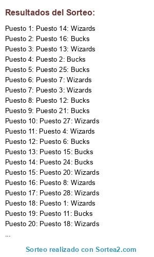 Lista de participantes: Puesto 1: Wizards, Puesto 2: Bucks, Puesto 3: Wizards, Puesto 4: Wizards, Puesto 5: Wizards, Puesto 6: Bucks, Puesto 7: Wizards, Puesto 8: Wizards, Puesto 9: Bucks, Puesto 10: Bucks, Puesto 11: Bucks, Puesto 12: Bucks, Puesto 13: Wizards, Puesto 14: Wizards, Puesto 15: Bucks, Puesto 16: Bucks, Puesto 17: Wizards, Puesto 18: Wizards, Puesto 19: Bucks, Puesto 20: Wizards, Puesto 21: Bucks, Puesto 22: Wizards, Puesto 23: Bucks, Puesto 24: Bucks, Puesto 25: Bucks, Puesto 26: Wizards, Puesto 27: Wizards, Puesto 28: Wizards.