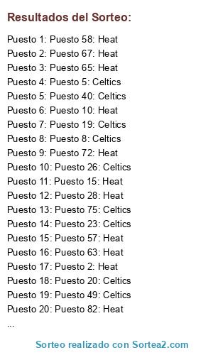 Lista de participantes: Puesto 1: Heat, Puesto 2: Heat, Puesto 3: Celtics, Puesto 4: Celtics, Puesto 5: Celtics, Puesto 6: Heat, Puesto 7: Heat, Puesto 8: Celtics, Puesto 9: Celtics, Puesto 10: Heat, Puesto 11: Heat, Puesto 12: Heat, Puesto 13: Heat, Puesto 14: Celtics, Puesto 15: Heat, Puesto 16: Heat, Puesto 17: Heat, Puesto 18: Heat, Puesto 19: Celtics, Puesto 20: Celtics, Puesto 21: Celtics, Puesto 22: Celtics, Puesto 23: Celtics, Puesto 24: Heat, Puesto 25: Celtics, Puesto 26: Celtics, Puesto 27: Celtics, Puesto 28: Heat, Puesto 29: Heat, Puesto 30: Celtics, Puesto 31: Heat, Puesto 32: Heat, Puesto 33: Heat, Puesto 34: Heat, Puesto 35: Celtics, Puesto 36: Heat, Puesto 37: Celtics, Puesto 38: Celtics, Puesto 39: Celtics, Puesto 40: Celtics, Puesto 41: Celtics, Puesto 42: Celtics, Puesto 43: Heat, Puesto 44: Celtics, Puesto 45: Celtics, Puesto 46: Celtics, Puesto 47: Heat, Puesto 48: Heat, Puesto 49: Celtics, Puesto 50: Heat, Puesto 51: Heat, Puesto 52: Celtics, Puesto 53: Heat, Puesto 54: Heat, Puesto 55: Celtics, Puesto 56: Heat, Puesto 57: Heat, Puesto 58: Heat, Puesto 59: Heat, Puesto 60: Celtics, Puesto 61: Celtics, Puesto 62: Heat, Puesto 63: Heat, Puesto 64: Celtics, Puesto 65: Heat, Puesto 66: Heat, Puesto 67: Heat, Puesto 68: Celtics, Puesto 69: Celtics, Puesto 70: Celtics, Puesto 71: Heat, Puesto 72: Heat, Puesto 73: Celtics, Puesto 74: Heat, Puesto 75: Celtics, Puesto 76: Heat, Puesto 77: Celtics, Puesto 78: Heat, Puesto 79: Heat, Puesto 80: Heat, Puesto 81: Heat, Puesto 82: Heat, Puesto 83: Celtics, Puesto 84: Celtics, Puesto 85: Heat, Puesto 86: Celtics, Puesto 87: Heat.