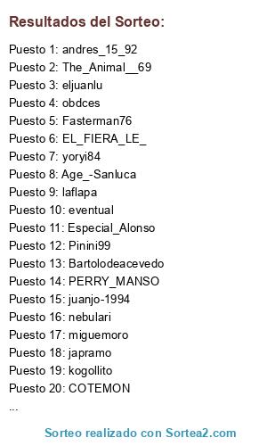 Lista de participantes: juanjo-1994, eljuanlu, EL_FIERA_LE_, PERRY_MANSO, The_Animal__69, churraca, yoryi84, japramo, andres_15_92, nebulari, Fasterman76, obdces, COTEMON, eventual, Pinini99, laflapa, Especial_Alonso, miguemoro, Bartolodeacevedo, kogollito, Age_-Sanluca.