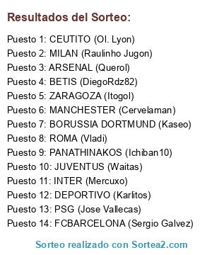 Lista de participantes: MILAN (Raulinho Jugon), JUVENTUS (Waitas), BORUSSIA DORTMUND (Kaseo), INTER (Mercuxo), ARSENAL (Querol), FCBARCELONA (Sergio Galvez), BETIS (DiegoRdz82), ZARAGOZA (Itogol), PSG (Jose Vallecas), MANCHESTER (Cervelaman), DEPORTIVO (Karlitos), ROMA (Vladi), CEUTITO (Ol. Lyon), PANATHINAKOS (Ichiban10).