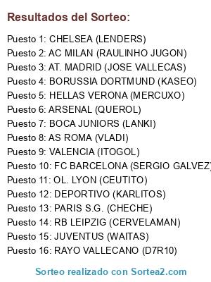 Lista de participantes: PARIS S.G. (CHECHE), CHELSEA (LENDERS), ARSENAL (QUEROL), RAYO VALLECANO (D7R10), HELLAS VERONA (MERCUXO), FC BARCELONA (SERGIO GALVEZ), JUVENTUS (WAITAS), BORUSSIA DORTMUND (KASEO), AC MILAN (RAULINHO JUGON), AT. MADRID (JOSE VALLECAS), BOCA JUNIORS (LANKI), VALENCIA (ITOGOL), DEPORTIVO (KARLITOS), OL. LYON (CEUTITO), RB LEIPZIG (CERVELAMAN), AS ROMA (VLADI).