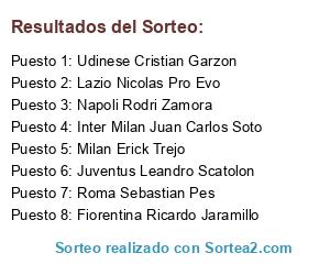 Lista de participantes: Milan Erick Trejo, Lazio Nicolas Pro Evo, Juventus Leandro Scatolon, Udinese Cristian Garzon, Fiorentina Ricardo Jaramillo, Napoli Rodri Zamora, Inter Milan Juan Carlos Soto, Roma Sebastian Pes.