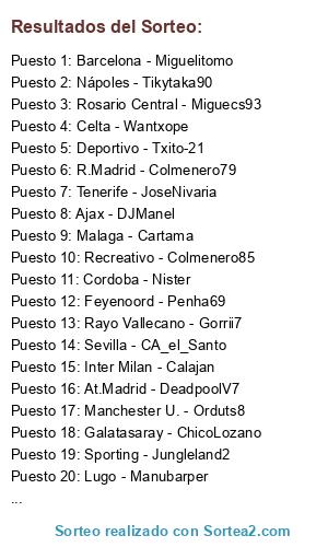 Lista de participantes: Rayo Vallecano - Gorrii7, Juventus - Raulaia, Inter Milan - Calajan, At.Madrid - DeadpoolV7, Sporting - Jungleland2, Malaga - Cartama, Deportivo - Txito-21, Rosario Central - Miguecs93, Feyenoord - Penha69, R.Madrid - Colmenero79, AC Milan - Rnst84, Manchester U. - Orduts8, Galatasaray - ChicoLozano, Celta - Wantxope, Lugo - Manubarper, Girona - Poder_Negrito, Tenerife - JoseNivaria, Ajax - DJManel, Recreativo - Colmenero85, Nápoles - Tikytaka90, Barcelona - Miguelitomo, Sevilla - CA_el_Santo, Villarreal - Kokoatake, Cordoba - Nister.