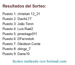Lista de participantes: kellsilva20111, thiflaa, RPirro, Coroa Cabo Frio, Daniel_Mourinho07, birrao, Elias filho 18, Luiz Madureira, RafaelTeixeira027, Vitor Pessa, mvxavier.