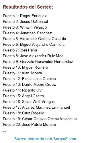 Lista de participantes: Participantes , Juan Manuel Guzman Sosa , Angel Castro , Heider Radamanthys , Rigo Reyes , Silver Wolf Villegas , Jorge Salinas Diaz , Carlos Alberto Chany , Neftali Diaz Dorazco , Edgar Hernandez Dragneel , Jesus UcNahuat , Jonathan Sanchez , Swift Jes , Edwar Alexander Castañeda , Carlos Adrian Martinez Lopez , Alejandro Herrera , Sekiryuutei Reyes , Damian Ureño , Edu Arias , Jonatan Ramirez , Alvarez Martinez Emmanuel , Jesus Saenz , Andhy Ovando , Miguel Alejandro Carrillo L , Fernando Flores Pineda , Ricardo Cornejo , Olaf Baez , Jose Pulido Moreno , Erick Rangel , Alexander Gomez Gallardo , Arthur Garmo , Juan Montiel , Daniel Wauthion Vargas , Fabian Gustavo , Cruz Rogelio , Javier Rodriguez Marcial , Osvaldo Hernandez , Gonzalo Benavides Hernandez , Cesar Octavio Ochoa Velazquez , Juan Jose , Carlos Perez , Dante Moore Creew , Winwin Velasco , Hugo Cesar HR , Miguel Romero , Gildardo Moreno Lima , Ricardo CV , Koizumi Hanayo , Roger Enriquez , luis Herrera , Christoff M.c. , Cline Marco , Ian Matco Hdz , Brayan Pinkamena Daian Pie , Carlos N , Ernesto_perez06 , Roberto Oviedo , Matt Cardozo , Toni Peña , Alan Acosta , Felipe Jose Cuevas , Goo Ramirez , Ares Evo , Sergio Alejandro Ochoa Silva , Jose Alexander Ruiz Mdo , Antonio Barragan , Daniel RG , Jose Manuel Lima Osorio , Brack Yerro , Jorge Esquivel.