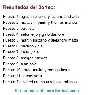 Lista de participantes: alan polo, leonel vera, matias impinisi y thomas muñoz, martin balzano y alejandro matta, pachito y cia, Leito y cia, seba feijo y gato damore, robertino insua y lucas robledo, agustin brusco y luciano andrada, jorge malito y rodrigo insua, bautista, amigos nacocs.