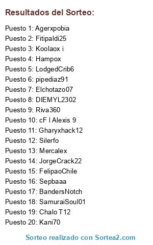 Lista de participantes: SamuraiSoul01, Hampox, Elchotazo07, Sepbaaa, pipediaz91, Mercalex, JorgeCrack22, BandersNotch, cF l Alexis 9, Kani70, Fitipaldi25, Agerxpobia, FelipaoChile, Koolaox i, Silerfo, Riva360, Jaavieeer, LodgedCrib6, DIEMYL2302, Gharyxhack12.