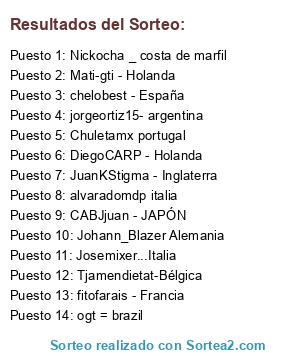 Lista de participantes: DiegoCARP - Holanda, Josemixer...Italia, fitofarais - Francia, CABJjuan - JAPÓN, Tjamendietat-Bélgica, ogt = brazil, Chuletamx portugal, Mati-gti - Holanda, Nickocha _ costa de marfil, jorgeortiz15- argentina, Johann_Blazer Alemania, alvaradomdp italia, chelobest - España, JuanKStigma - Inglaterra.
