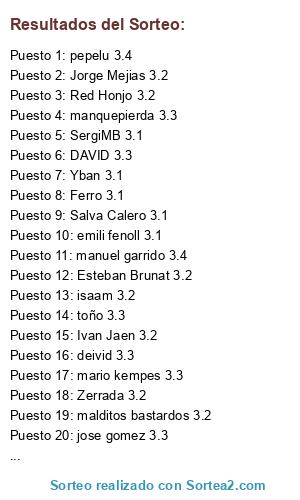 Lista de participantes: morta 3.1, hector lopez 3.1, aiub 3.1, sebas romero 3.1, isma Fdez 3.1, SergiMB 3.1, Salva Calero 3.1, Luka Trunks 3.1, Yban 3.1, emili fenoll 3.1, Ferro 3.1, Real Jenniv 3.2, isaam 3.2, Esteban Brunat 3.2, Jota Garcia 3.2, Red Honjo 3.2, Jorge Mejias 3.2, malditos bastardos 3.2, Ivan Jaen 3.2, Zerrada 3.2, manquepierda 3.3, mario kempes 3.3, DAVID 3.3, deivid 3.3, perico17 3.3, karlos 3.3, jose gomez 3.3, toño 3.3, Administrador 3.3, juan romero 3.4, pepelu 3.4, estrella galicia 3.4, arquillos 3.4, raulioford4 3.4, atripi88maga 3.4, jowii fc 3.4, huracan 3.4, javier 3.4, manuel garrido 3.4, adri maga 3.4.