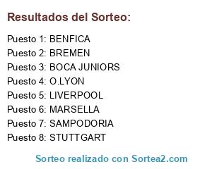 Lista de participantes: BREMEN, LIVERPOOL, BOCA JUNIORS, SAMPODORIA, O.LYON, MARSELLA, BENFICA, STUTTGART.
