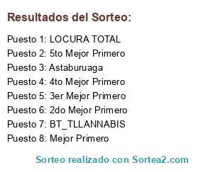 Lista de participantes: BT_TLLANNABIS, Astaburuaga, LOCURA TOTAL, Mejor Primero, 2do Mejor Primero, 3er Mejor Primero, 4to Mejor Primero, 5to Mejor Primero.