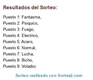 Lista de participantes: Fuego,, Electrico,, Normal,, Volador,, Fantasma,, Lucha,, Psiquico,, Bicho,, Acero,.