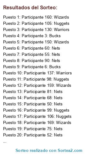 Lista de participantes: Participante 1: Bucks, Participante 2: Bucks, Participante 3: Bucks, Participante 4: Bucks, Participante 5: Bucks, Participante 6: Bucks, Participante 7: Bucks, Participante 8: Bucks, Participante 9: Bucks, Participante 10: Bucks, Participante 11: Bucks, Participante 12: Bucks, Participante 13: Bucks, Participante 14: Bucks, Participante 15: Bucks, Participante 16: Bucks, Participante 17: Bucks, Participante 18: Bucks, Participante 19: Bucks, Participante 20: Bucks, Participante 21: Bucks, Participante 22: Bucks, Participante 23: Bucks, Participante 24: Bucks, Participante 25: Hawks, Participante 26: Hawks, Participante 27: Hawks, Participante 28: Hawks, Participante 29: Hawks, Participante 30: Hawks, Participante 31: Hawks, Participante 32: Hawks, Participante 33: Hawks, Participante 34: Hawks, Participante 35: Hawks, Participante 36: Hawks, Participante 37: Hawks, Participante 38: Hawks, Participante 39: Hawks, Participante 40: Hornets, Participante 41: Hornets, Participante 42: Hornets, Participante 43: Jazz, Participante 44: Jazz, Participante 45: Jazz, Participante 46: Jazz, Participante 47: Jazz, Participante 48: Jazz, Participante 49: Nets, Participante 50: Nets, Participante 51: Nets, Participante 52: Nets, Participante 53: Nets, Participante 54: Nets, Participante 55: Nets, Participante 56: Nets, Participante 57: Nets, Participante 58: Nets, Participante 59: Nets, Participante 60: Nets, Participante 61: Nets, Participante 62: Nets, Participante 63: Nets, Participante 64: Nets, Participante 65: Nets, Participante 66: Nets, Participante 67: Nets, Participante 68: Nets, Participante 69: Nets, Participante 70: Nets, Participante 71: Nets, Participante 72: Nets, Participante 73: Nets, Participante 74: Nets, Participante 75: Nets, Participante 76: Nets, Participante 77: Nets, Participante 78: Nets, Participante 79: Nets, Participante 80: Nets, Participante 81: Nets, Participante 82: Nets, Participante 83: Nets, Participante 84: Nets, Participante 85: Nets, Participante 86: Nets, Participante 87: Nets, Participante 88: Nets, Participante 89: Nets, Participante 90: Nets, Participante 91: Nets, Participante 92: Nuggets, Participante 93: Nuggets, Participante 94: Nuggets, Participante 95: Nuggets, Participante 96: Nuggets, Participante 97: Nuggets, Participante 98: Nuggets, Participante 99: Nuggets, Participante 100: Nuggets, Participante 101: Nuggets, Participante 102: Nuggets, Participante 103: Nuggets, Participante 104: Nuggets, Participante 105: Nuggets, Participante 106: Nuggets, Participante 107: Nuggets, Participante 108: Timberwolves, Participante 109: Timberwolves, Participante 110: Timberwolves, Participante 111: Timberwolves, Participante 112: Timberwolves, Participante 113: Timberwolves, Participante 114: Timberwolves, Participante 115: Timberwolves, Participante 116: Timberwolves, Participante 117: Timberwolves, Participante 118: Timberwolves, Participante 119: Timberwolves, Participante 120: Timberwolves, Participante 121: Timberwolves, Participante 122: Timberwolves, Participante 123: Timberwolves, Participante 124: Timberwolves, Participante 125: Timberwolves, Participante 126: Timberwolves, Participante 127: Timberwolves, Participante 128: Warriors, Participante 129: Warriors, Participante 130: Warriors, Participante 131: Warriors, Participante 132: Warriors, Participante 133: Warriors, Participante 134: Warriors, Participante 135: Warriors, Participante 136: Warriors, Participante 137: Warriors, Participante 138: Warriors, Participante 139: Warriors, Participante 140: Warriors, Participante 141: Warriors, Participante 142: Warriors, Participante 143: Warriors, Participante 144: Warriors, Participante 145: Wizards, Participante 146: Wizards, Participante 147: Wizards, Participante 148: Wizards, Participante 149: Wizards, Participante 150: Wizards, Participante 151: Wizards, Participante 152: Wizards, Participante 153: Wizards, Participante 154: Wizards, Participante 155: Wizards, Participante 156: Wizards, Participante 157: Wizards, Participante 158: Wizards, Participante 159: Wizards, Participante 160: Wizards, Participante 161: Wizards, Participante 162: Wizards, Participante 163: Wizards, Participante 164: Wizards, Participante 165: Wizards, Participante 166: Wizards, Participante 167: Wizards, Participante 168: Wizards, Participante 169: Wizards.