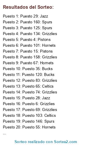Lista de participantes: Puesto 1: Spurs, Puesto 2: Bucks, Puesto 3: Spurs, Puesto 4: Pistons, Puesto 5: Jazz, Puesto 6: Grizzlies, Puesto 7: Celtics, Puesto 8: Spurs, Puesto 9: Hornets, Puesto 10: Spurs, Puesto 11: Pistons, Puesto 12: Spurs, Puesto 13: Celtics, Puesto 14: Celtics, Puesto 15: Pistons, Puesto 16: Hornets, Puesto 17: Spurs, Puesto 18: Pistons, Puesto 19: Hornets, Puesto 20: Hornets, Puesto 21: Hornets, Puesto 22: Spurs, Puesto 23: Hornets, Puesto 24: Pistons, Puesto 25: Hornets, Puesto 26: Hornets, Puesto 27: Bucks, Puesto 28: Jazz, Puesto 29: Jazz, Puesto 30: Jazz, Puesto 31: Spurs, Puesto 32: Celtics, Puesto 33: Celtics, Puesto 34: Grizzlies, Puesto 35: Bucks, Puesto 36: Hornets, Puesto 37: Pistons, Puesto 38: Spurs, Puesto 39: Jazz, Puesto 40: Jazz, Puesto 41: Pistons, Puesto 42: Grizzlies, Puesto 43: Spurs, Puesto 44: Hornets, Puesto 45: Hornets, Puesto 46: Jazz, Puesto 47: Celtics, Puesto 48: Jazz, Puesto 49: Grizzlies, Puesto 50: Grizzlies, Puesto 51: Jazz, Puesto 52: Celtics, Puesto 53: Bucks, Puesto 54: Celtics, Puesto 55: Hornets, Puesto 56: Jazz, Puesto 57: Celtics, Puesto 58: Spurs, Puesto 59: Bucks, Puesto 60: Spurs, Puesto 61: Pistons, Puesto 62: Hornets, Puesto 63: Spurs, Puesto 64: Bucks, Puesto 65: Celtics, Puesto 66: Celtics, Puesto 67: Hornets, Puesto 68: Spurs, Puesto 69: Grizzlies, Puesto 70: Pistons, Puesto 71: Celtics, Puesto 72: Celtics, Puesto 73: Pistons, Puesto 74: Grizzlies, Puesto 75: Jazz, Puesto 76: Spurs, Puesto 77: Celtics, Puesto 78: Celtics, Puesto 79: Hornets, Puesto 80: Jazz, Puesto 81: Hornets, Puesto 82: Hornets, Puesto 83: Grizzlies, Puesto 84: Grizzlies, Puesto 85: Jazz, Puesto 86: Celtics, Puesto 87: Bucks, Puesto 88: Spurs, Puesto 89: Hornets, Puesto 90: Hornets, Puesto 91: Celtics, Puesto 92: Jazz, Puesto 93: Hornets, Puesto 94: Bucks, Puesto 95: Hornets, Puesto 96: Spurs, Puesto 97: Hornets, Puesto 98: Jazz, Puesto 99: Bucks, Puesto 100: Spurs, Puesto 101: Hornets, Puesto 102: Hornets, Puesto 103: Celtics, Puesto 104: Grizzlies, Puesto 105: Celtics, Puesto 106: Hornets, Puesto 107: Hornets, Puesto 108: Hornets, Puesto 109: Bucks, Puesto 110: Grizzlies, Puesto 111: Hornets, Puesto 112: Spurs, Puesto 113: Celtics, Puesto 114: Grizzlies, Puesto 115: Grizzlies, Puesto 116: Spurs, Puesto 117: Grizzlies, Puesto 118: Pistons, Puesto 119: Pistons, Puesto 120: Bucks, Puesto 121: Spurs, Puesto 122: Spurs, Puesto 123: Jazz, Puesto 124: Grizzlies, Puesto 125: Spurs, Puesto 126: Jazz, Puesto 127: Grizzlies, Puesto 128: Pistons, Puesto 129: Pistons, Puesto 130: Celtics, Puesto 131: Celtics, Puesto 132: Bucks, Puesto 133: Hornets, Puesto 134: Grizzlies, Puesto 135: Jazz, Puesto 136: Celtics, Puesto 137: Hornets, Puesto 138: Celtics, Puesto 139: Pistons, Puesto 140: Grizzlies, Puesto 141: Celtics, Puesto 142: Grizzlies, Puesto 143: Bucks, Puesto 144: Grizzlies, Puesto 145: Bucks, Puesto 146: Spurs, Puesto 147: Jazz, Puesto 148: Grizzlies, Puesto 149: Celtics, Puesto 150: Hornets, Puesto 151: Spurs, Puesto 152: Spurs, Puesto 153: Celtics, Puesto 154: Grizzlies, Puesto 155: Pistons, Puesto 156: Hornets, Puesto 157: Spurs, Puesto 158: Grizzlies, Puesto 159: Grizzlies, Puesto 160: Spurs, Puesto 161: Grizzlies, Puesto 162: Spurs, Puesto 163: Celtics, Puesto 164: Hornets, Puesto 165: Pistons, Puesto 166: Hornets, Puesto 167: Celtics, Puesto 168: Celtics, Puesto 169: Bucks, Puesto 170: Jazz, Puesto 171: Hornets, Puesto 172: Pistons, Puesto 173: Grizzlies, Puesto 174: Jazz, Puesto 175: Jazz.
