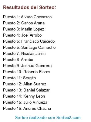 Lista de participantes: Nicolas Jarrin, Carlos Arana, Joshua Guerrero, Sergito, Arrobo, Roberto Flores, Joel Arrobo, Marlin Lopez, Andres Chacha, Francisco Caicedo, Alvaro Chevasco, Julio Vinueza, Kenny Leon, Daniel Salazar, Santiago Camacho, Allan Suarez.