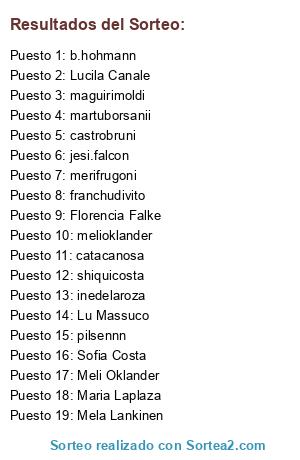 Lista de participantes: Florencia Falke, shiquicosta, Sofia Costa, martuborsanii (2 participaciones), Mela Lankinen, inedelaroza, melioklander (2 participaciones), Lucila Canale, Maria Laplaza, b.hohmann (3 participaciones), merifrugoni (2 participaciones), catacanosa (2 participaciones), franchudivito, castrobruni, jesi.falcon, pilsennn, maguirimoldi, Lu Massuco (2 participaciones), Meli Oklander , Meli Oklander.