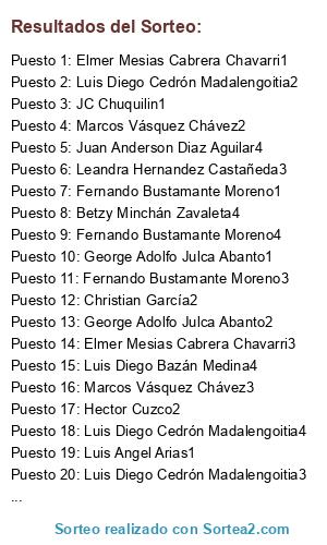Lista de participantes: Christian García1, Christian García2, Christian García3, Christian García4, Elmer Mesias Cabrera Chavarri1, Elmer Mesias Cabrera Chavarri2, Elmer Mesias Cabrera Chavarri3, Elmer Mesias Cabrera Chavarri4, Fernando Bustamante Moreno1, Fernando Bustamante Moreno2, Fernando Bustamante Moreno3, Fernando Bustamante Moreno4, George Adolfo Julca Abanto1, George Adolfo Julca Abanto2, George Adolfo Julca Abanto3, George Adolfo Julca Abanto4, Jhoselyn Villanueva Bazán1, Jhoselyn Villanueva Bazán2, Jhoselyn Villanueva Bazán3, Jhoselyn Villanueva Bazán4, Leandra Hernandez Castañeda1, Leandra Hernandez Castañeda2, Leandra Hernandez Castañeda3, Leandra Hernandez Castañeda4, Luis Angel Arias1, Luis Angel Arias2, Luis Angel Arias3, Luis Angel Arias4, Luis Diego Bazán Medina1, Luis Diego Bazán Medina2, Luis Diego Bazán Medina3, Luis Diego Bazán Medina4, Marcos Vásquez Chávez2, Marcos Vásquez Chávez1, Marcos Vásquez Chávez3, Marcos Vásquez Chávez4, Max Franklin Villena Herrera1, Max Franklin Villena Herrera2, Max Franklin Villena Herrera3, Max Franklin Villena Herrera4, Pedro A. Pajares Portal1, Pedro A. Pajares Portal2, Pedro A. Pajares Portal3, Pedro A. Pajares Portal4, JC Chuquilin1, JC Chuquilin2, JC Chuquilin3, JC Chuquilin4, Juan Anderson Diaz Aguilar1, Juan Anderson Diaz Aguilar2, Juan Anderson Diaz Aguilar3, Juan Anderson Diaz Aguilar4, Leo Franco Tafur Ravines1, Leo Franco Tafur Ravines2, Leo Franco Tafur Ravines4, Leo Franco Tafur Ravines3, Leonardo Javier Díaz Aguilar1, Leonardo Javier Díaz Aguilar2, Leonardo Javier Díaz Aguilar3, Leonardo Javier Díaz Aguilar4, Luis Diego Cedrón Madalengoitia1, Luis Diego Cedrón Madalengoitia2, Luis Diego Cedrón Madalengoitia3, Luis Diego Cedrón Madalengoitia4, Betzy Minchán Zavaleta1, Betzy Minchán Zavaleta2, Betzy Minchán Zavaleta3, Betzy Minchán Zavaleta4, Hector Cuzco1, Hector Cuzco2, Hector Cuzco3, Hector Cuzco4.