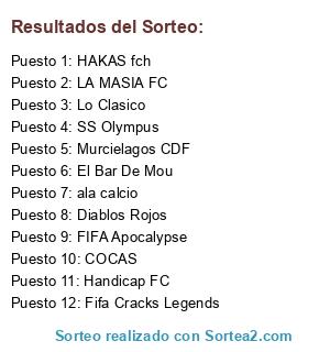 Lista de participantes: Lo Clasico, ala calcio, COCAS, SS Olympus, FIFA Apocalypse, Fifa Cracks Legends, El Bar De Mou, Diablos Rojos, Handicap FC, Murcielagos CDF, HAKAS fch , LA MASIA FC.