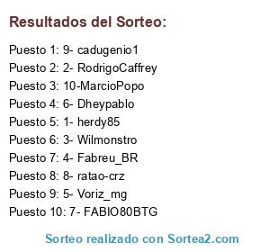 Lista de participantes: 1- herdy85, 2- RodrigoCaffrey, 3- Wilmonstro, 4- Fabreu_BR, 5- Voriz_mg, 6- Dheypablo, 7- FABIO80BTG, 8- ratao-crz, 9- cadugenio1, 10-MarcioPopo.