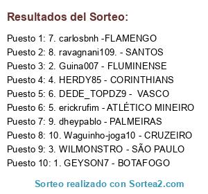 Lista de participantes: 1. GEYSON7 - BOTAFOGO, 2. Guina007 - FLUMINENSE, 3. WILMONSTRO - SÃO PAULO, 4. HERDY85 - CORINTHIANS, 5. erickrufim - ATLÉTICO MINEIRO, 6. DEDE_TOPDZ9 - VASCO , 7. carlosbnh -FLAMENGO, 8. ravagnani109. - SANTOS , 9. dheypablo - PALMEIRAS, 10. Waguinho-joga10 - CRUZEIRO.