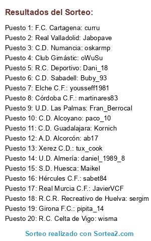 Lista de participantes: Hércules C.F.: sabet84, C.D. Sabadell: Buby_93, U.D. Almería: daniel_1989_8, Córdoba C.F.: martinares83, Real Valladolid: Jabopave, R.C. Deportivo: Dani_18, A.D. Alcorcón: ab17, U.D. Las Palmas: Fran_Berrocal, C.D. Guadalajara: Kornich, Xerez C.D.: tux_cook, R.C. Celta de Vigo: wisma, Elche C.F.: yousseff1981, C.D. Alcoyano: paco_10, Real Murcia C.F.: JavierVCF, R.C.R. Recreativo de Huelva: sergim, Girona F.C.: pipita_14, C.D. Numancia: oskarmp, S.D. Huesca: Maikel, Club Gimástic: oWuSu, F.C. Cartagena: curru.