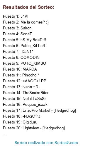 Lista de participantes: DarKpoweR, Pablo_KiLLeR!, SoneT, Extremadamente manco, BaSii, kamar0n, .DaN1*, Loquendo, kyreN, beat, westbrook, chuck norris FCB, -N3cr0f!r3, <AAGG>LPP, Sakon, NoTiLLaSsSs, TheSnakeBiter, retobato, pRo./n/O/o/B/^ : D, vper *, Pakit0_Arny, Kalo, MARCA, PUTO_KIMBO, Pinocho *, nan0, ALFA7, MCR, Pampa, Guanche, lol, << L3tt0FF - GoIt! >>, cS MacheTe Pucea, Lightview - [Hedgedhog], ErizoPro Maikel - [Hedgedhog], Pequeo_isaak, poky, coL i FloR, NyTro, MoNsTeR_KiLL!, itS My BeaT::!!, Oskar, david*gl?, usa1N, Auu, Spumy, ivann =D, IVAAAAAAAAAN, F.B.I Nicolas, .::GEN::., J4VI, Me la comes? :), Gigiduru, COMODIN.