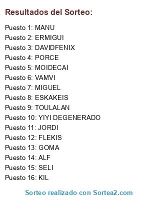 Lista de participantes: ALF, MIGUEL, YIYI DEGENERADO, KIL, TOULALAN, ESKAKEIS, MANU, GOMA, JORDI, ERMIGUI, FLEKIS, VAMVI, PORCE, DAVIDFENIX, MOIDECAI, SELI.