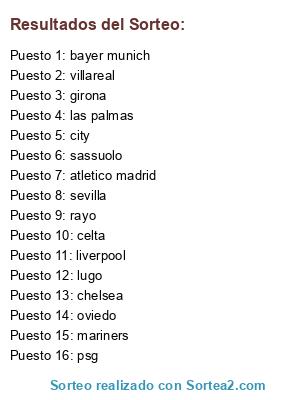 Lista de participantes: chelsea, mariners, atletico madrid, psg, celta, girona, bayer munich, sevilla, city, liverpool, oviedo, villareal, las palmas, lugo, rayo, sassuolo.